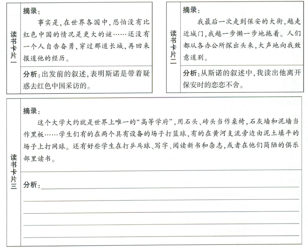 专题,小组同学为《红星照耀中国》制作了读书卡片。请以下面已完成的读书卡片为例,完善读书卡