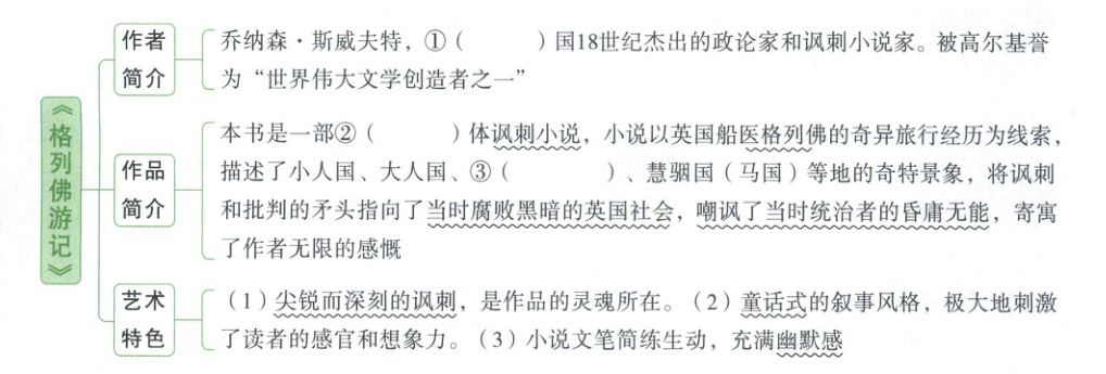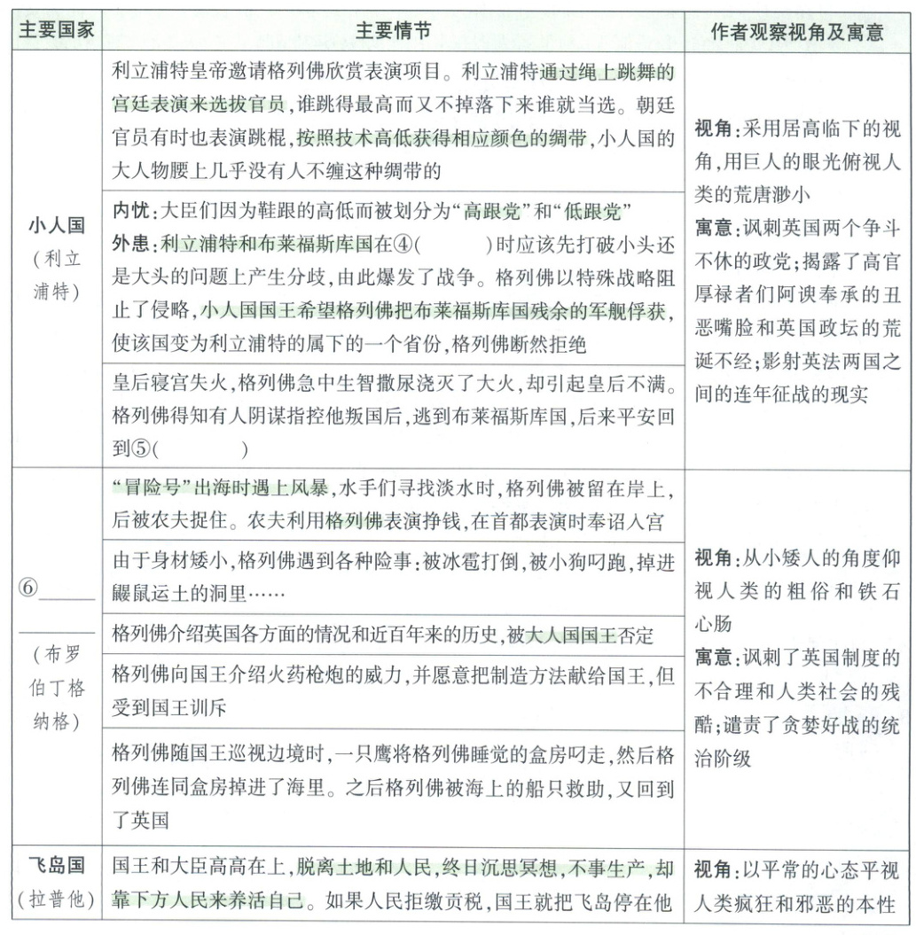 梳理答案:①英 ②游记 ③飞岛国 ④吃鸡蛋 ⑤英国 ⑥大人国