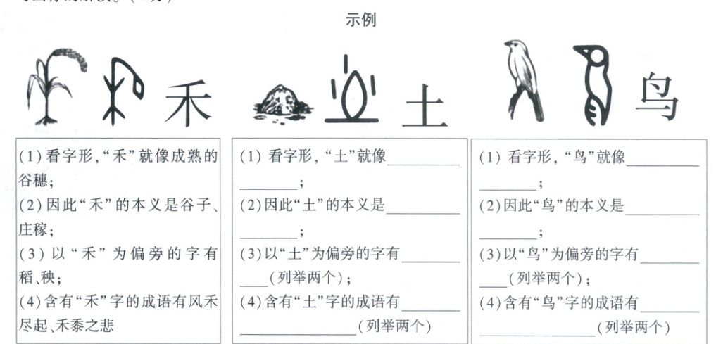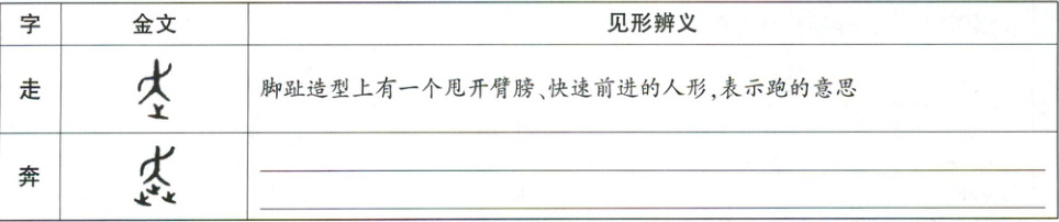 4.(2025 石家庄长安区模拟)汉字是世界上最具意蕴的文字。请观察下面三个与“止”相关的金文字形的变化,参照解说,填写表格。(2 分)