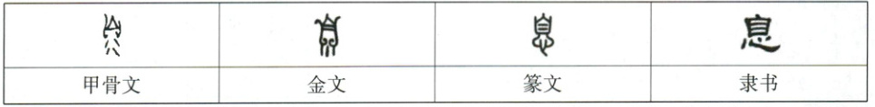 (1)通过观察以上图片可知,“息”是由心和自组成的会意字和形声字。自,就是鼻子,兼而作声旁。造字之初的古人还不知道有肺,以为气是从心里发出而通过鼻子来呼吸的。由此,我们可以推测“息”的本义是_。(1