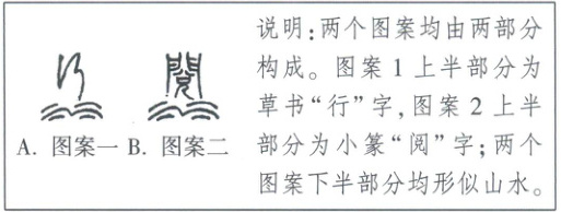 说明:两个图案均由两部分构成。图案1上半部分为草书“行”字,图案2上半部分为小篆“阅”字;两个图案下半部分均形似山水。