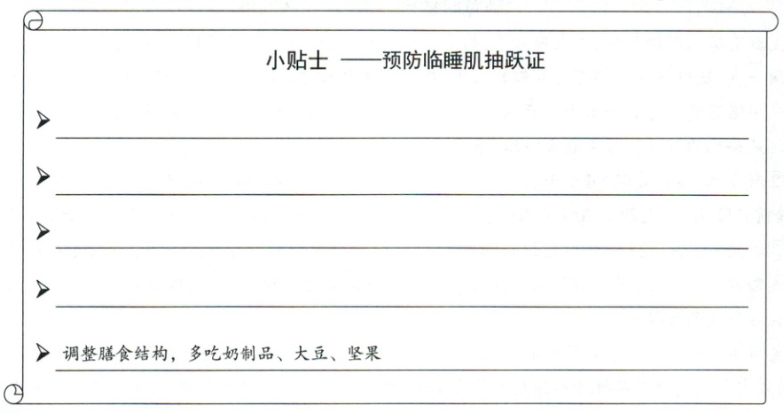⑥睡着睡着突然“抽”一下,不舒服且有些吓人,那么临睡肌抽跃症有没有预防方法呢?首先规律的睡眠很有必要,每天保证6到10小时睡眠,睡前可以听一些舒缓的音乐。睡觉时选择正确的睡姿,避免趴着睡、蜷着睡或者压迫身体等不良的睡姿。睡前不要喝含兴奋神经物质的饮料,咖啡因会引起神经兴奋,影响睡眠质量。睡觉之前可以用温热水泡脚,泡脚的时候,水最好浸泡到踝关节部位,持续15~20分钟,这样可以促进下肢的末梢神经血液循环,有利于缓解肌肉痉挛引起的睡眠抽动。睡前半小时还可进行适度的拉伸,使肌肉得到放松,也有利于降低睡眠抽动的发生几率。专家建议,因为缺钙导致的临睡肌抽跃症,可通过调整膳食结构缓解,多吃钙含量高的食物,如奶制品、大豆、坚果等。