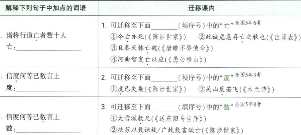 1. 亡:逃亡;可迁移至①④中的“亡”。