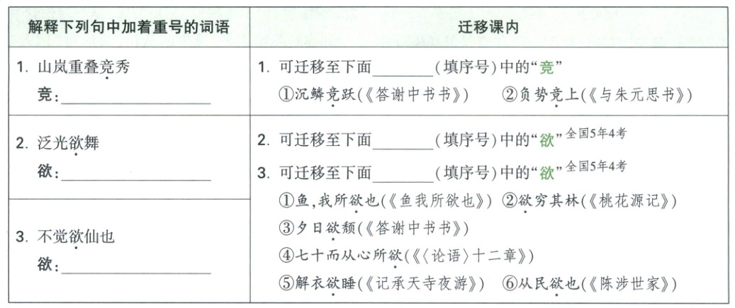 三、1.景物非常秀美,山高水净,绚烂多彩,充满无穷生机。2.①表现了作者对谢灵运的钦慕;②惋惜于世人对秀美山水的无动于衷;③为自己的审美情趣而自许,期与谢公比肩之意溢于言表。