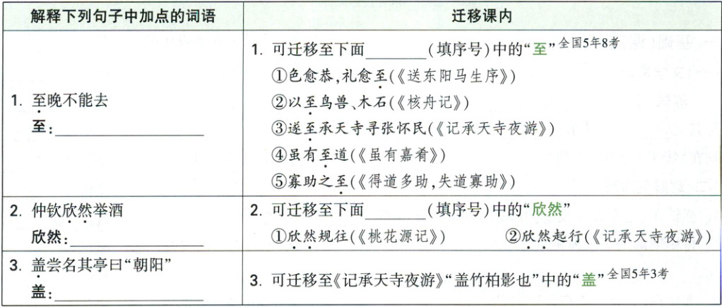三、1.①把月光比作水,写出了月光澄澈透明的美。②用竹子和柏树的影子来衬托月光的空灵明净。2.①“闲人”既指二人的政治处境,即作为贬谪之人,无职无权,清闲无比,内心悲凉无可诉说;又指夜游时的心境,即空灵自在,悠游自如,故能欣赏到一派空明的景象。②“闲人”既含有自嘲、自慰之意,又颇有自许的意味,表现了一种达观的生活态度。