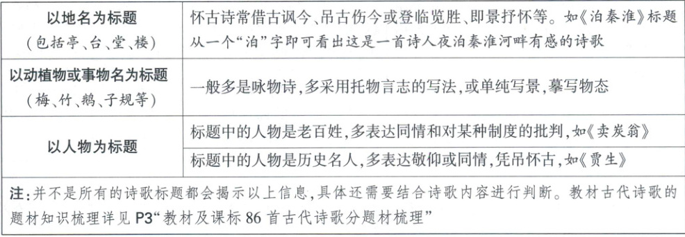 注:并不是所有的诗歌标题都会揭示以上信息,具体还需要结合诗歌内容进行判断。教材古代诗歌的题材知识梳理详见P3“教材及课标86首古代诗歌分题材梳理”