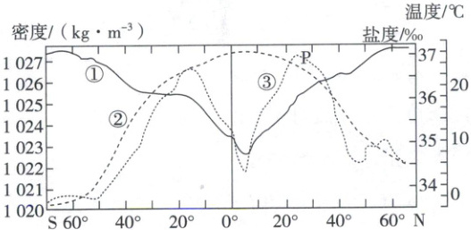 6.B 海水的盐度 ③曲线在P处达到最高值表明在副热带地区盐度最高,副热带地区常年受副热带高气压带的控制,全年炎热干燥,降水较少,蒸发量大于降水量,入海径流少,导致海水盐度高,B正确,D错误;海水温度最高出现在赤道附近,A错误;入海径流丰富,海水盐度应较低,C错误。