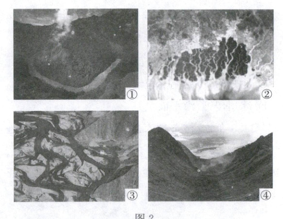 4.B河流地貌的发育图2中③景观是典型的辫状水系,因河流流量不稳定,暴涨暴落,相对于流量而言,含沙量很大,并且不均一。当洪峰到来时,河流迅速拓宽河床,河道堆积,形成水下浅滩。洪峰过后,许多浅滩出露水面,成为沙岛。故形成辫状水系的条件有:河流流量大且季节变化大、河流含沙量大和河床平坦宽阔,B正确,A,C,D错误。