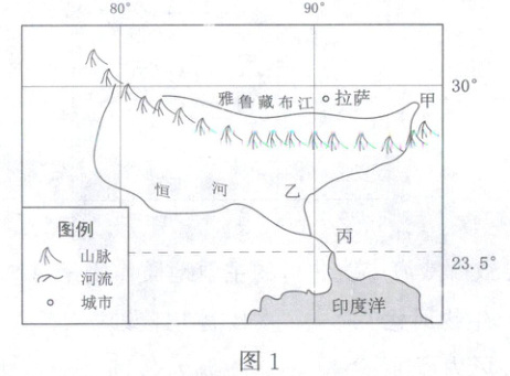 雅鲁藏布江发源于喜马拉雅山北麓,下游汇入恒河,注入印度洋。图 1 为世界局部区域略图,图 2 为该流域的地貌景观图,完成 3,4 题。