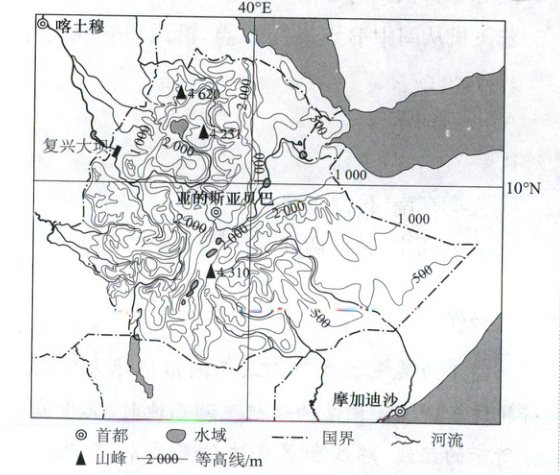 【解析】地形特征 描述地形特征的方法:描述地形的类型,描述地形的分布状况,描述地形的高低起伏状况。图中等高线在1000米以上,中部稀疏,周围密集,山峰在4000米以上,判断地形以高原、山地为主,整体海拔较高,中部高四周低,地势起伏大。