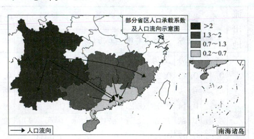 (3)指出广东省与其他省份的人口承载系数存在的差异,并简述这种差异对广东省人口、产业方面的有利影响。