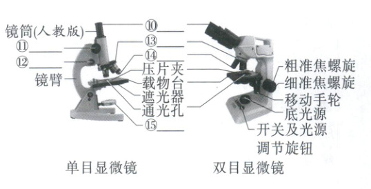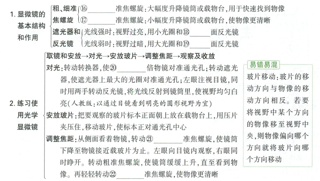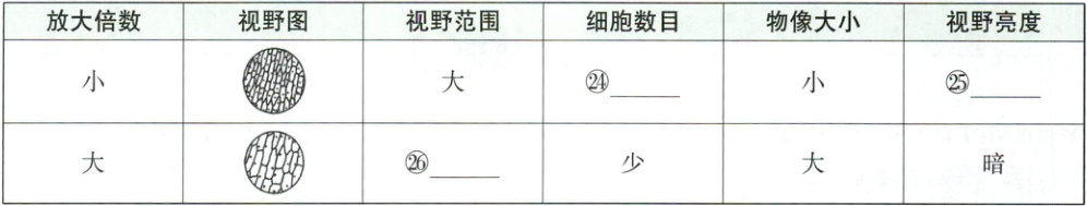 ⑧越大 ⑨越大 ⑩目镜 ⑪粗准焦螺旋 ⑫细准焦螺旋 ⑬转换器 ⑭物镜 ⑮反光镜 ⑯粗 ⑰细 ⑱平 ⑲凹 ⑳低 ㉑粗 ㉒细 ㉓物镜 ㉔多 ㉕亮 ㉖小 ㉗相反