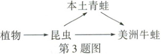 (3)[原因分析]从题干中找出美洲牛蛙成为典型入侵动物的一个自身原因:____。当美洲牛蛙入侵农田生态系统后,可形成如图所示的食物网,其中美洲牛蛙与本土青蛙的关系有____。
