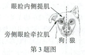 3. (2024 河北 22 题)狗由古代狼经长期驯化而来。科研人员对比狗和狼的面部肌肉,发现大多数狗的眼周围多了两块肌肉,如图所示。这两块肌肉相互配合使狗能表现出“可怜巴巴”的表情,但哈士奇(狗的品种)没有旁侧眼睑牵拉肌。下列说法错误的是(