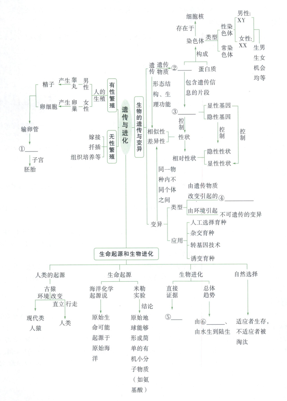 归纳总结 概念梳理 1①受精卵 ②DNA ③基因 ④可遗传的变异 ⑤化石 ⑥简单到复杂 “一境到底”练考点