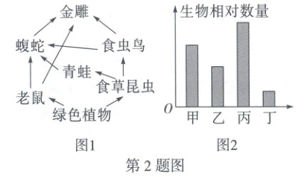 2. (2025 黑白卷)河北驼梁山国家森林公园总面积约 158 平方千米,有丰富的动植物资源,植被类型有高山草甸、落叶阔叶林、灌草丛等。图 1 是驼梁山国家森林公园中部分生物组成的食物网,图 2 是食物网中某条食物链中生物的相对数量。回答下列问题。