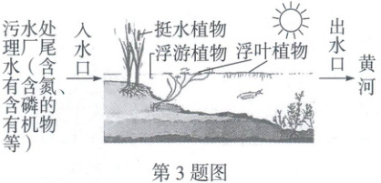 3. (2025 内蒙古)为落实国家加强非常规水源利用的环保要求,内蒙古某地将污水处理厂尾水引入一人工湿地,利用该湿地的净水功能,让“一泓清水入黄河”的同时美化了环境,吸引众多游客观光游憩。如图为该人工湿地的示意图,回答下列问题。