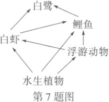7. (2025 驻马店) 宿鸭湖湿地凭借优越的区位生态和人文关怀已成为中国最大的人造鸟类栖息地,填补了珍稀候鸟迁徙美丽中国的关键拼图。该湿地生态系统中部分生物构成的食物网如图所示。下列叙述正确的是 (