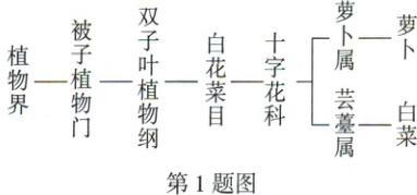 1. (2024河北6题)萝卜、白菜是常见的蔬菜,这两种植物在生物学上的分类地位如图所示。图中包含植物种类最多的分类等级是(