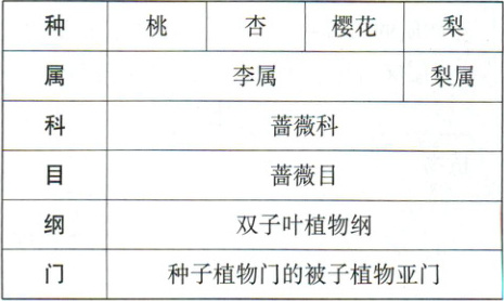 2. (2025石家庄模拟改编)早春时节,街头常见桃花、杏花、梨花、樱花争奇斗艳,令人赏心悦目。四种植物的分类关系如下表,以下相关说法错误的是(
