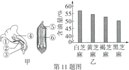 _ 将来发育为⑥。(4)芝麻种皮颜色丰富多样,用途也有一定的差异。不同颜色芝麻的含油量如图乙所示,据图分析最适合榨取香油的是
