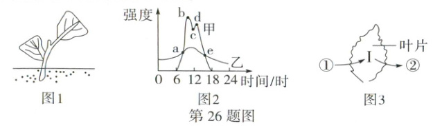 (3)图2中b点时光合作用强度大于呼吸作用强度,说明此时刻植物吸收二氧化碳,释放氧气,则图3中的①代表二氧化碳,②代表氧气。