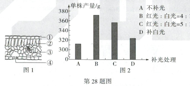 28. (8分)河北省邯郸市的紫园生态园,在草莓成熟期引得游客争相前往。图1是草莓叶片的部分结构示意图。回答下列问题。