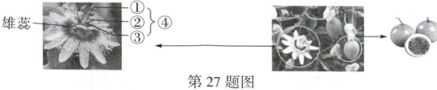 27. (6分)黄金百香果具有独特的香气和酸甜可口的口感,富含维生素C、膳食纤维和多种矿物质,具有很高的营养价值。如图为黄金百香果的生长过程示意图,回答下列问题。