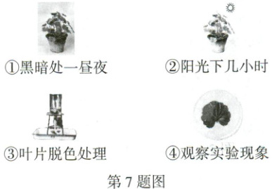 7. (武老师快答 App·答疑高频试题³²次)如图表示“绿叶在光下制造有机物”的部分实验步骤。下列相关叙述正确的是(