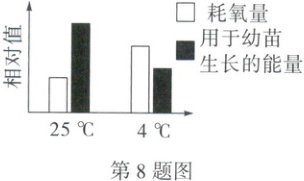 8. (2025 烟台)农民伯伯在培育黄瓜幼苗时,常采用短时低温处理以提高幼苗的抗寒能力。短时低温对幼苗的呼吸作用有什么影响呢?科研人员用黄瓜幼苗进行了实验,结果如图。下列相关说法错误的是(