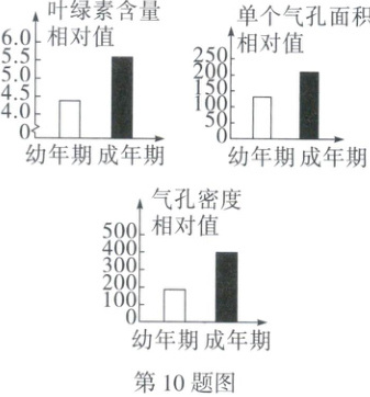 10. (2025 广西)广西青梅是我国一级保护野生植物,主要分布在广西和云南。广西青梅的成年树木生长良好,但幼苗较难正常生长为成年树,导致它的繁衍受到严重限制。科研人员对广西青梅不同生长发育阶段叶片结构和生理差异进行了研究,结果如图所示。回答下列问题。