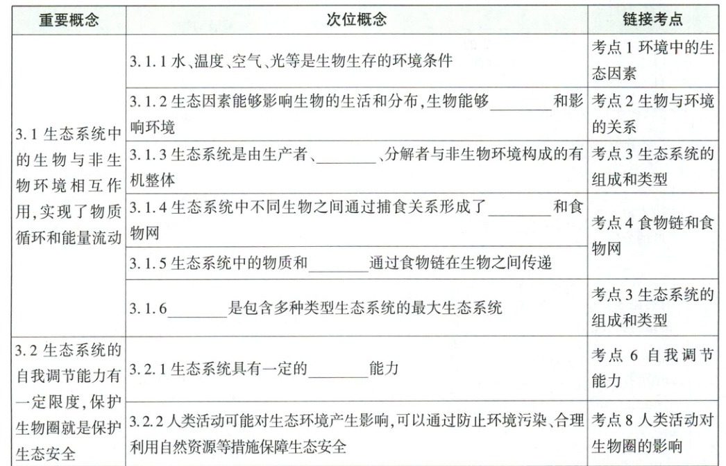 3.1.2适应 3.1.3消费者 3.1.4食物链 3.1.5能量 3.1.6生物圈 3.2.1自我调节