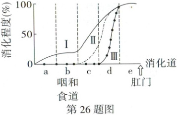 26. (7 分)在有关饮食习惯健康的宣讲会上,老师结合食物在人体中的消化过程,提出了几条良好的饮食习惯。图中曲线(Ⅰ、Ⅱ、Ⅲ)分别表示三大营养物质在消化道中各部位的消化程度,回答下列问题。