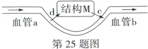 25. 如图是人体内气体交换过程模式图,血管 a、b 为结构 M 周围的毛细血管,c、d 为气体。下列叙述正确的是(
