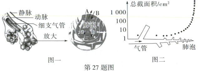 27. (7 分)雾化吸入疗法是指用雾化装置将药物分散成微小的雾滴或微粒,药液通过呼吸系统进入患者血液,以达到治疗疾病的目的。图一为肺泡结构示意图(A、B 表示过程,a、b 表示气体),图二为气管、支气管及肺泡的总截面积对比图,回答下列问题。