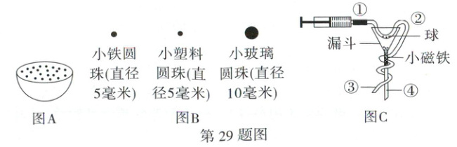 29. (7 分)生物兴趣小组利用注射器、漏斗、透明塑料软管、小磁铁(贴在漏斗下端的内部)、球(内部如图 A 所示,在球的水平面有个塑料隔板,隔板上有很多的小孔)、三种小圆珠若干(如图 B),制作肾单位模型(如图 C),回答下列问题。