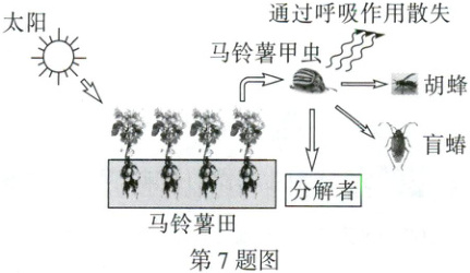 7. (2025河北27题)马铃薯是重要的粮食作物。马铃薯甲虫取食马铃薯植株的叶片和嫩茎,导致马铃薯产量下降,是马铃薯毁灭性害虫,防治难度大。如图为防治过程中马铃薯田能量流动部分过程示意图。