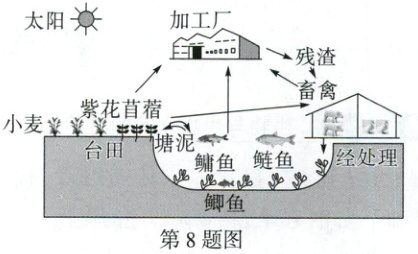 8. (2024河北27题)发展生态农业,助力乡村振兴。某地积极开发低洼盐碱地渔农综合利用模式,如图所示。回答下列问题。