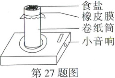 27. (6分)学习了耳和听觉的形成过程后,某生物学兴趣小组选取了卷纸筒、橡皮膜、食盐、小音响等材料制成耳的鼓膜振动模型(如图),回答下列问题。