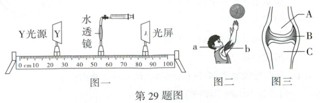 29. (7分)贵州省台江县台盘村“六月六”吃新节篮球赛,因其激烈的赛况被网友们亲切称呼为“村BA”。图一是小冀利用物理实验室的光具座及配件来模拟人的眼球成像过程,图三是运动员的关节结构示意图,回答下列问题。
