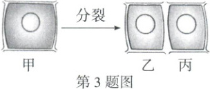 3. (2025 成都) 细胞分裂是生物体生长、发育和繁殖的基础。甲细胞经分裂形成乙、丙两个新细胞 (如图), 下列关于该过程的叙述, 正确的是 (