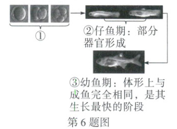 6. 万唯原创 鱼卵经一系列变化, 长出鱼鳍、鱼尾等, 最终发育成灵活游动的小鱼, 穿梭于水草间, 实在神奇。下图表示鱼从受精卵发育为成体的全过程。回答下列问题。