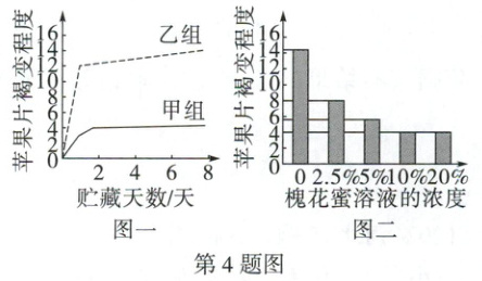 4. (2025 河北 30 题)将苹果去皮、切块制成的鲜切苹果,因方便食用深受人们喜爱,但很容易发生褐变,导致观感不佳,营养价值下降。有人提出了“蜂蜜对鲜切苹果的褐变有一定抑制作用”的说法。为了探究该说法是否成立,科研人员用槐花蜜和国光苹果进行了实验一,部分操作如下表,结果如图一所示。