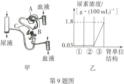 9. 万唯原创 图甲为人体尿液的形成过程示意图,A、B、C 表示肾单位的结构。图乙表示某健康人的肾单位内尿素的含量变化,图中①②③代表组成肾单位的结构,请据图回答下列问题: