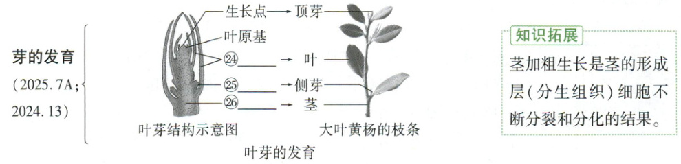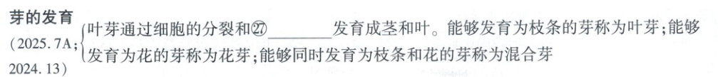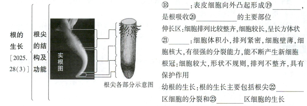 ⑱成熟区 ⑲根毛 ⑳水和无机盐 ㉑分生区 ㉒分生 ㉓伸长㉔幼叶 ㉕芽原基 ㉖芽轴 ㉗分化
