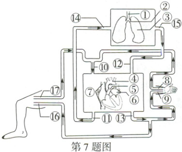 7. (2025 陕西)“病来如山倒,病去如抽丝。”某患者出现了胸闷、咳嗽、发烧和膝关节疼痛等症状,在家自行服用上次未使用完的青霉素类药物,几天后病情未缓解,在家人的陪同下前往医院。经医生诊断为耐药性金黄色葡萄球菌引起的肺炎和关节炎,给予静脉注射万古霉素的处理。如图是人体循环示意图。请回答问题。