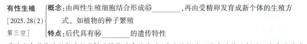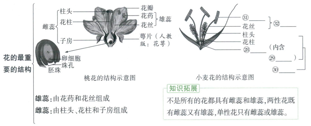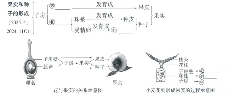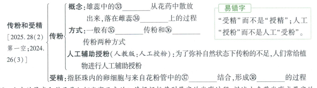 ㉘子房 ㉙胚珠 ㉚雌蕊 ㉛花药 ㉜雄蕊 ㉝花粉 ㉞柱头 ㉟自花 ㊱异花(与前一空可互换) ㊲精子 ㊳受精卵 ㊴子房壁 ㊵胚珠 ㊶胚 ㊷果皮 ㊸种子 ㊹果实