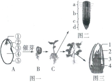(填序号)构成。从 B 发育成 C 的过程中,消耗的营养物质主要源于种子结构中的[④
