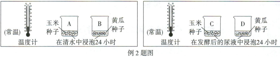 例2 在农业生产中,农民常在播种前将种子进行浸泡处理。用发酵后的尿液浸种是否有利于种子的萌发呢?小冀同学选择100粒玉米和黄瓜种子进行探究,具体过程如下图所示,请据此分析回答问题。