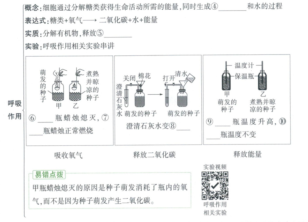1. ①二氧化碳 ②有机物 ③筛管 2. ④二氧化碳 ⑤能量 ⑥甲 ⑦乙 ⑧浑浊 ⑨甲 ⑩乙